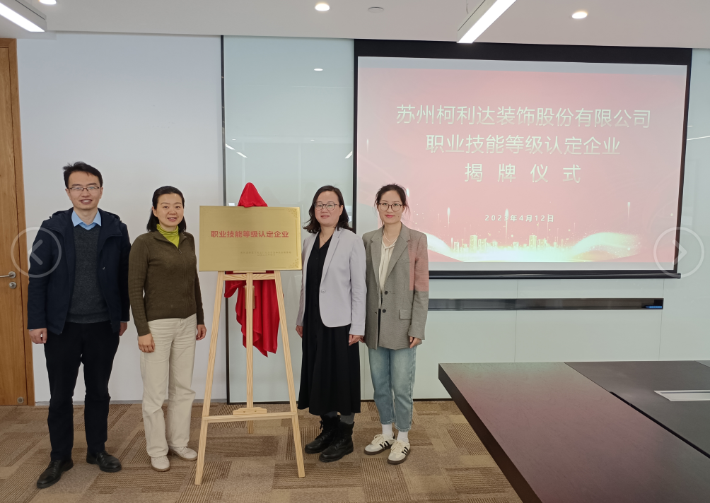 4月12日,蘇州柯利達(dá)裝飾股份有限公司在研發(fā)大樓舉行“職業(yè)技能等級(jí)認(rèn)定企業(yè)”揭牌儀式,蘇州市高新區(qū)獅山橫塘街道組織人事和社會(huì)保障局局長周麗平、柯利達(dá)人事總監(jiān)嚴(yán)琳出席揭牌儀式。
