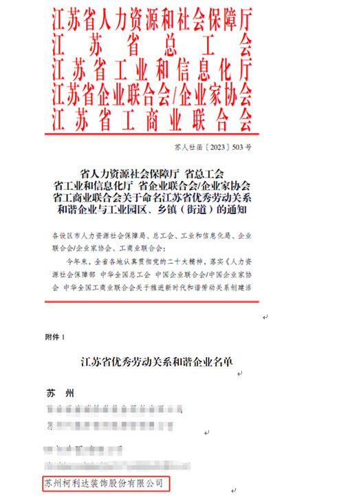 喜報!柯利達榮獲“江蘇省優(yōu)秀勞動關(guān)系和諧企業(yè)”